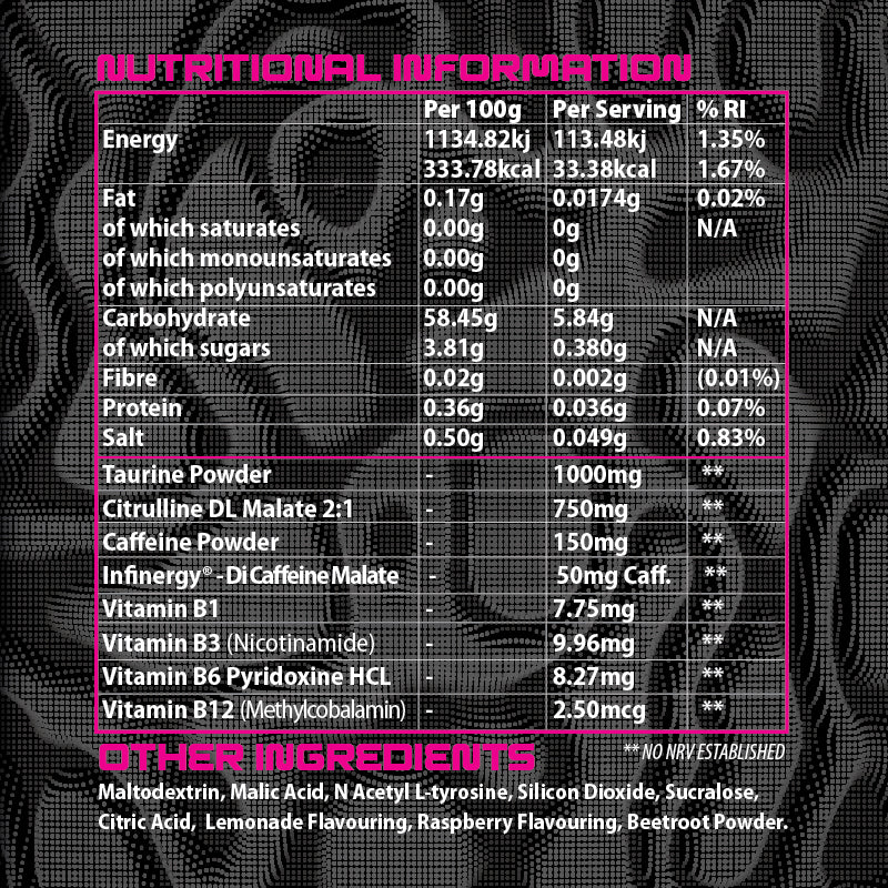 Is Reinforced Raspberry Lemonade your LOADOUT of choice? This great, refreshing blend of vitamins, nutrients, 150mg of caffeine and 1000mg of Taurine per serving will increase stamina and keep you going stronger for longer. An easy to dissolve blend, packed full of flavour, Reinforced Raspberry Lemonade is here to carry you to the win.